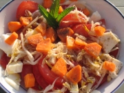 Esta fresca y colorida ensalada es de una gran facilidad de preparación, combina perfectamente como plato principal o como entrada de una comida más elaborada. Los ingredientes necesarios son: 4 tomates, 1 queso Mozarella, 300 gr. de germen de soya fresco, 2 zanahorias, 2 cucharas de aceite de oliva, 5 hojas de menta, sal y pimienta.